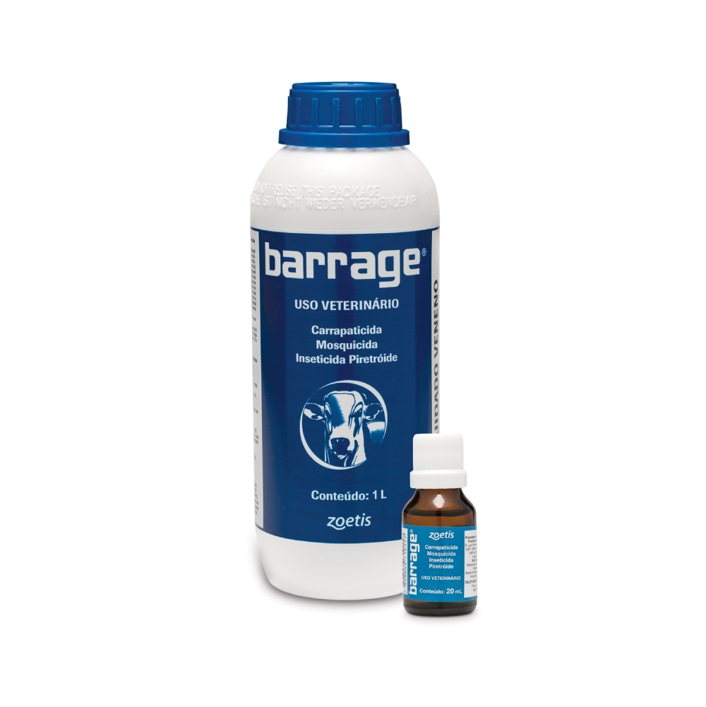 Mosquicida para bovinos facilmente emulsionável em água, Barrage® deve ser usado em banheiros de imersão ou em pulverização, podendo ser aplicado em pulverizadores manuais ou motorizados. É ativo contra todos os tipos de carrapatos em suas formas jovens ou adultas, inclusive às linhagens resistentes a carrapaticidas de outros grupos químicos. Baixa toxicidade. Muito eficaz contra a “mosca-dos-chifres“ (Haematobia irritans), apresenta boa estabilidade e permanece ativo por longo período de tempo.